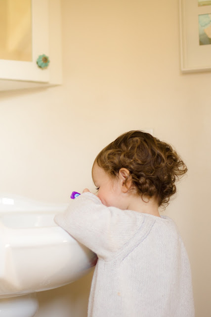 | Day 168/ "Teeth!" If this one starts calling out teeth..it means she wants to brush hers. This activity of putting water on her brush, brushing and spitting can keep her busy for a good long time. |